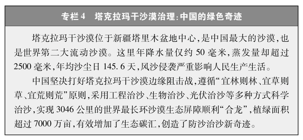 中国坚持系统观念,推进山水林田湖草沙一体化保护和系统治理,生态系统碳汇能力持续增强,在世界范围内率先实现土地退化“零增长”、荒漠化土地和沙化土地面积“双减少”,近20年来为全球贡献了约四分之一的新增绿化面积。