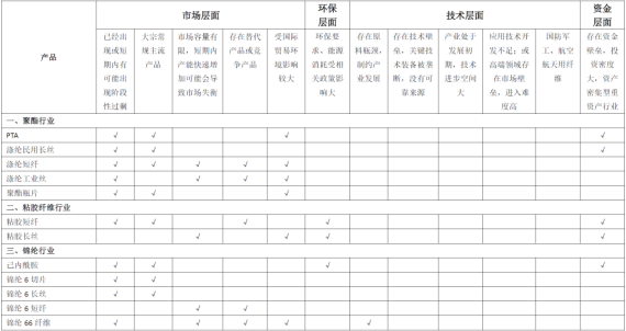 与2023年本相比,2026年本的分析层面和条件均保持不变,对锦纶行业以及高性能纤维行业、生物基纤维行业中部分细分行业的风险判断进行了调整,增加了对聚酯瓶片、锦纶长丝、氨纶和再生纤维素纤维等行业的关注。本次修订主要集中在来自市场层面的风险,需重点关注以下行业:
